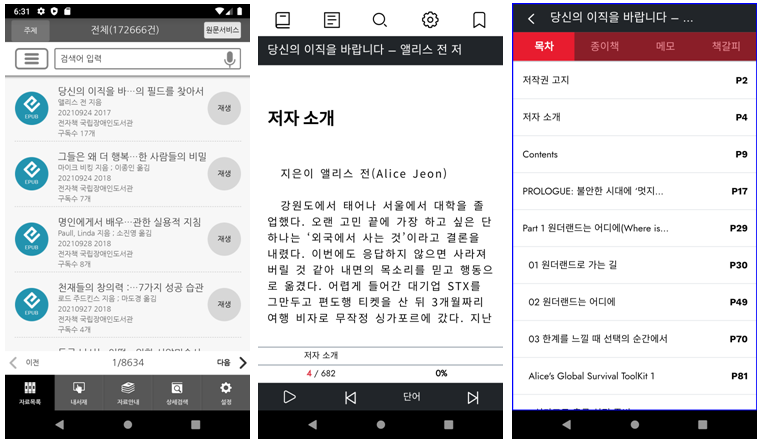 - 기능 : HTML5 기반 ePub 뷰어 연동, 음성안내 연동, PC고대비, 안드로이드 인앱웹서버